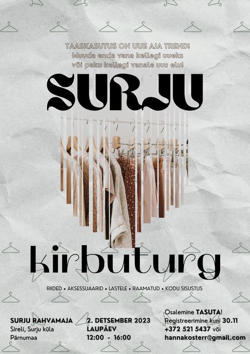 SURJU KIRBUTURG! TEEME KOOSTÖÖD! Rahvamajas ja Surju teeninduskeskuse esimesel korrusel: ROSAMUNDE hometextile; SINDRINAHK hõmblustarvikute hulgiladu; RAAMATUKOGU käsitööde näitus-müük, "Raamatud uuele ringile".