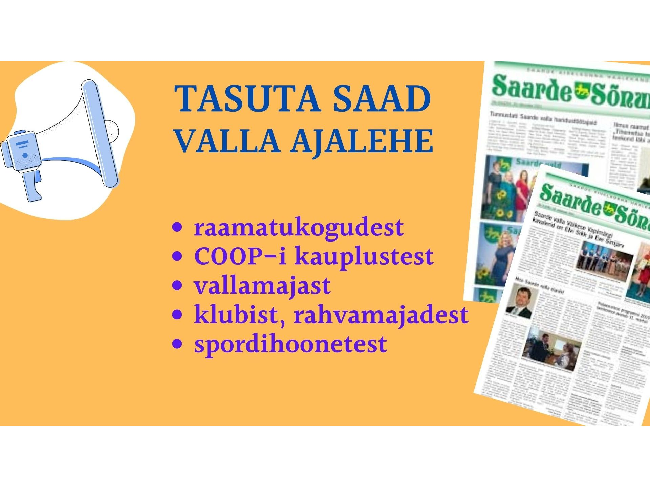 Alates tänasest saab paberkandjal ajalehte Saarde Sõnumid valla raamatukogudest, COOP-i kauplustest, vallamajast, klubist, raamatukogudest ja spordihoonetest võtta tasuta lugemiseks. Digiversiooni on võimalik lugeda valla kodulehelt.