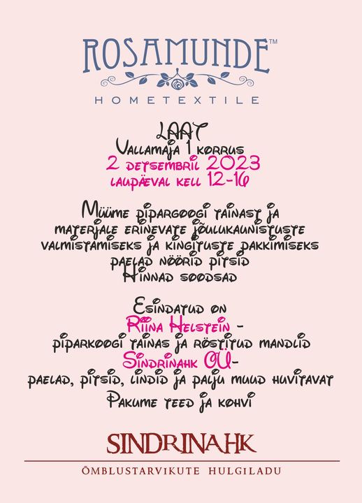 SURJU KIRBUTURG! TEEME KOOSTÖÖD! Rahvamajas ja Surju teeninduskeskuse esimesel korrusel: ROSAMUNDE hometextile; SINDRINAHK hõmblustarvikute hulgiladu; RAAMATUKOGU käsitööde näitus-müük, "Raamatud uuele ringile".