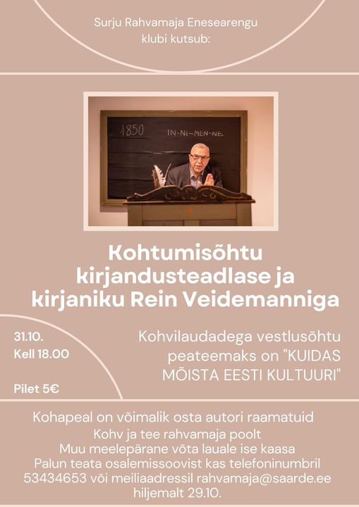* 31.10 kell 18 Surju rahvamaja enesearengu klubi - kohtumisõhtu kirjandusteadlase ja kirjaniku Rein